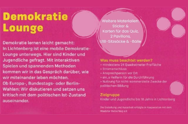 Bei uns könnt ihr euch die Demokratie Lounge ausleihen. Kontaktiert uns dafür einfach.